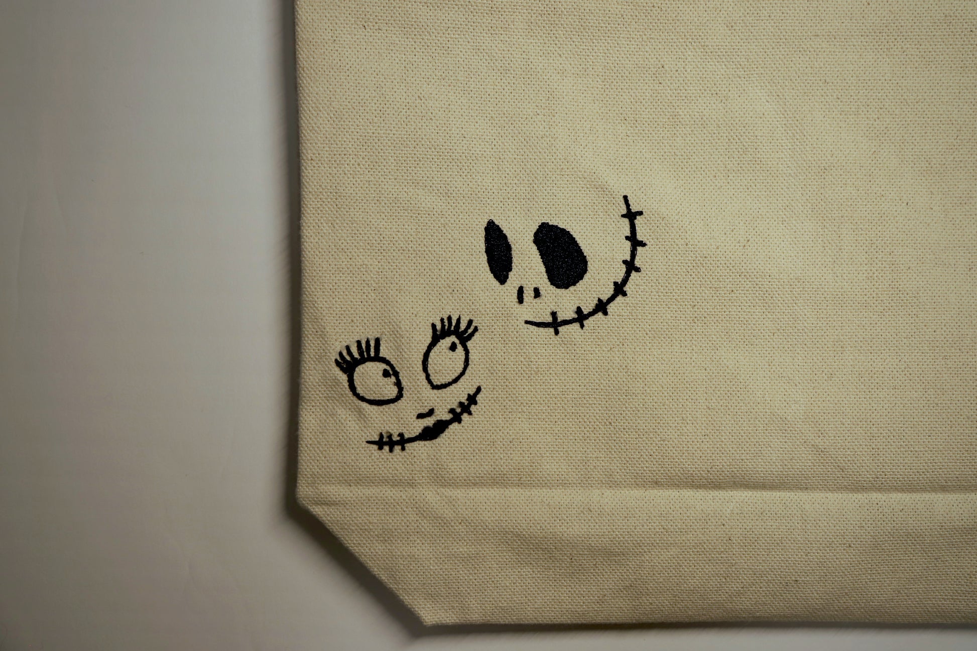 Carry a piece of Halloween Town with you wherever you go. This cream canvas tote features bold black handles and a beautifully embroidered design inspired by Jack and Sally from The Nightmare Before Christmas.